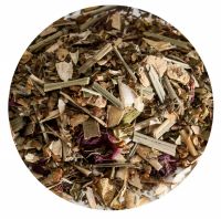 Zutaten: Tulsikraut, Lemongras, Ingwerstücke, Bohnenschalen, Zimtrinde, Mistelkraut, Kardamom, Johanniskraut, schwarzer Pfeffer, Rosenblüten,