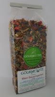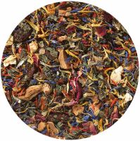Zutaten: Apfelstücke, Brombeer- und Brennnesselblätter, Sultanas, Orangen- und Zitronenschalen, Färberdisteln, Pfefferminze, Lemon-Myrtle, gefr.-getr. Erdbeerstücke, Kornblumenblüten, Ringelblumen- und Rosenblüten.
