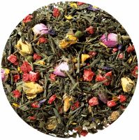 Zutaten: Grüner Sencha, gefr.-getr. Erdbeerstückchen, Rosenknospen, Malven- u. Sonnenblumenblüten, Himbeer-Fruchtessenz.